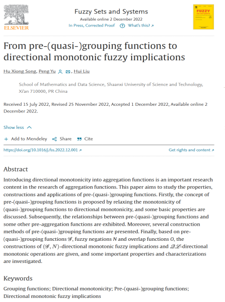 弱化聚合函数中的单调性,引入方向单调及弱单调性是聚合函数研究中的一个重要内容。在《From pre-(quasi-)grouping functions to directional monotonic fuzzy implications》一文中。于鹏副教授带领研究生宋虎雄等经过长时间探索将(拟-)分组函数中的单调性拓展为方向单调性,提出并研究了预-(拟-)分组函数的概念与性质。给出了预-(拟-)分组函数的几种构造方法。同时,基于预-(拟-)分组函数、模糊否定和重叠函数,构造了-方向单调模糊蕴涵和-方向单调算子,并对以上方向单调算子进行了刻画。相关结果的取得为进一步研究具有弱单调性的聚合函数打下了基础。